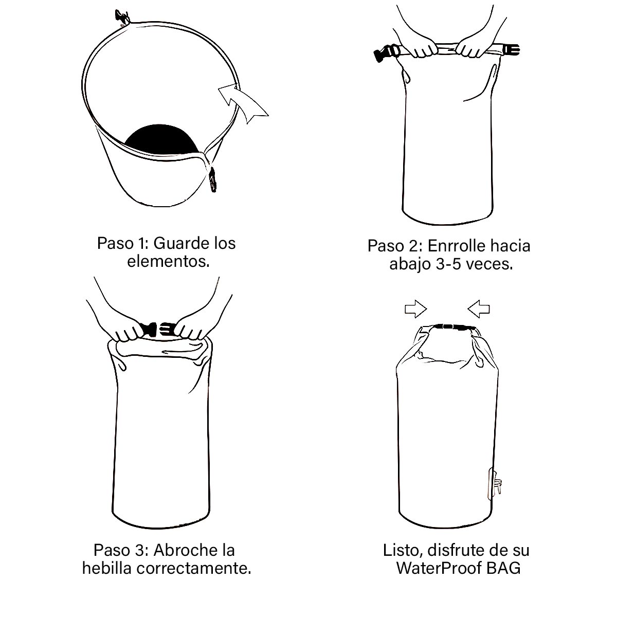 Solo debes enrollar la parte superior 2 o 3 veces y ajustar las hebillas. Así, evitarás filtraciones de agua, polvo o suciedad.