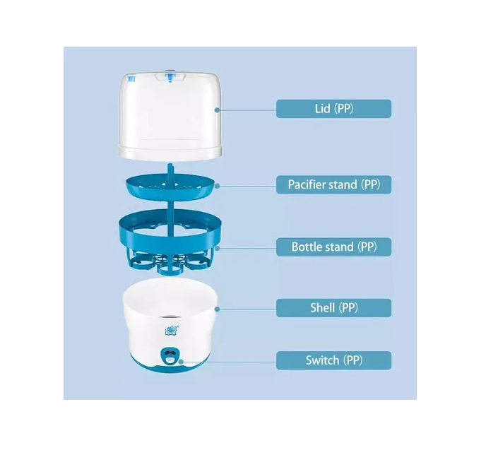 El esterilizador de vapor KIDSHOP es muy útil porque tiene la capacidad de esterilizar 6 teteros y accesorios en sus bandejas. Su acción esterilizadora mata todas las bacterias dañinas en calor intenso en 8 minutos aproximadamente. Tiene la ventaja de adaptarse a biberones de diferentes formas. Cuando termina el ciclo de esterilización se apaga automáticamente. Es libre de BPA. Es fácil de usar y de limpiar. Se caracteriza por su diseño moderno y compacto.