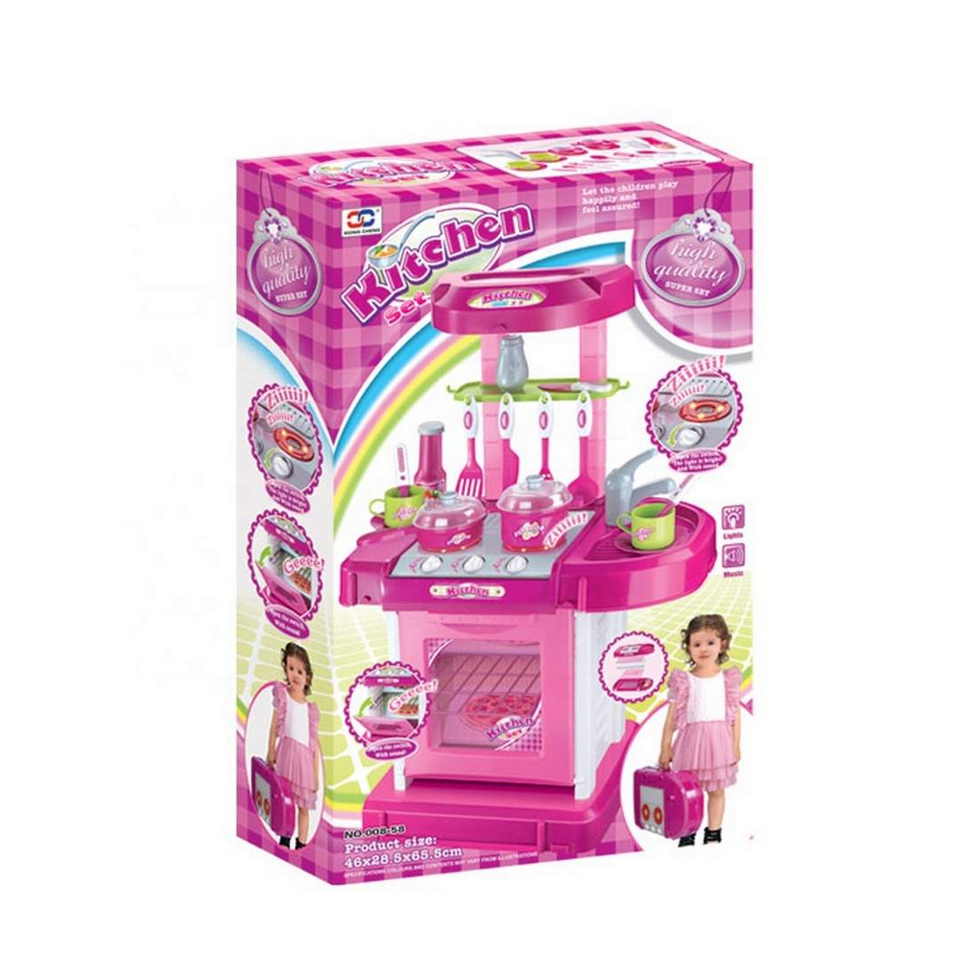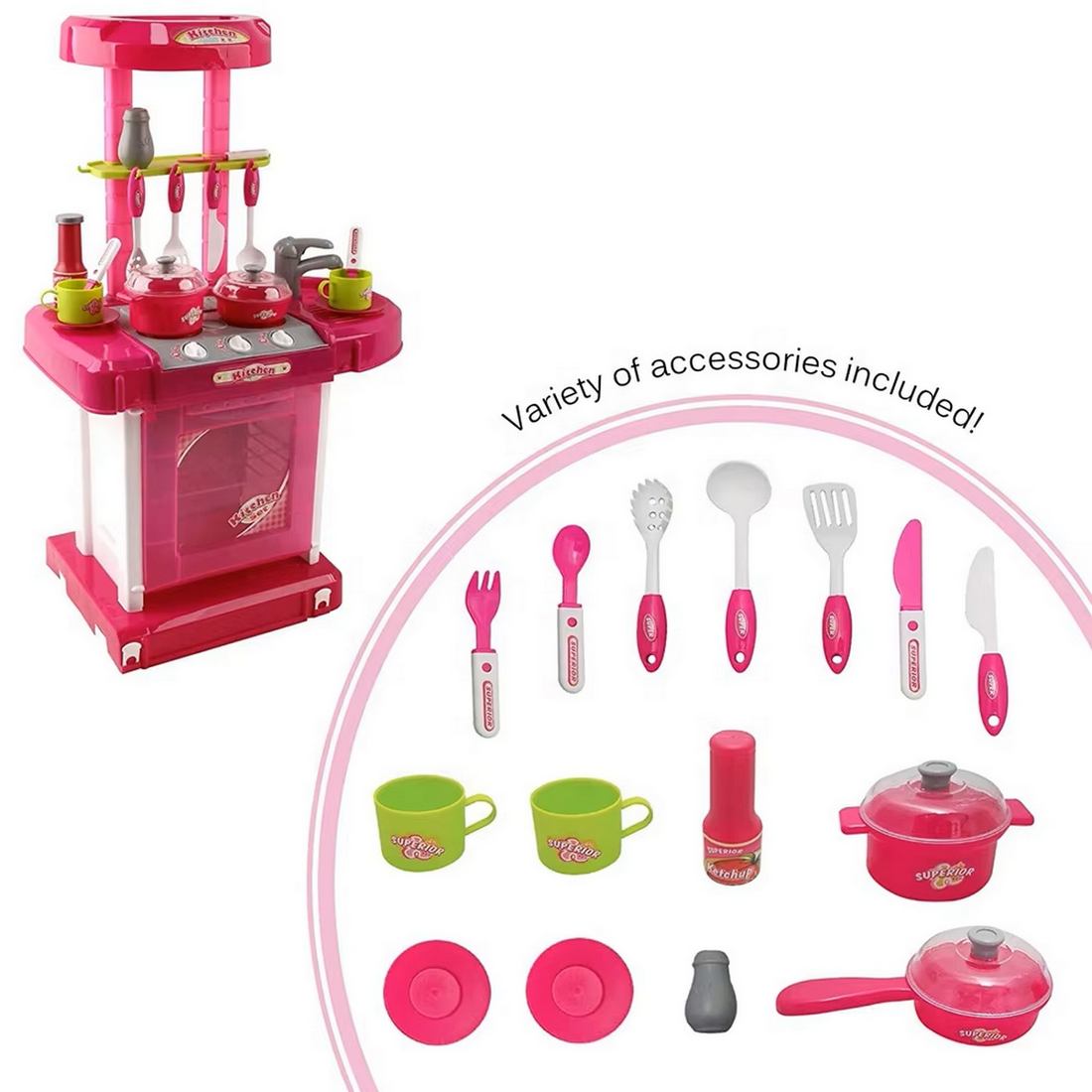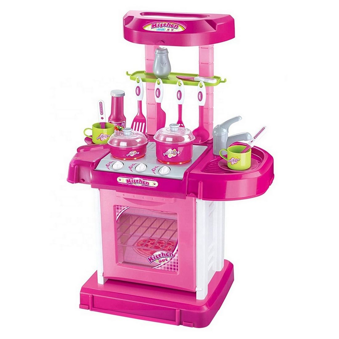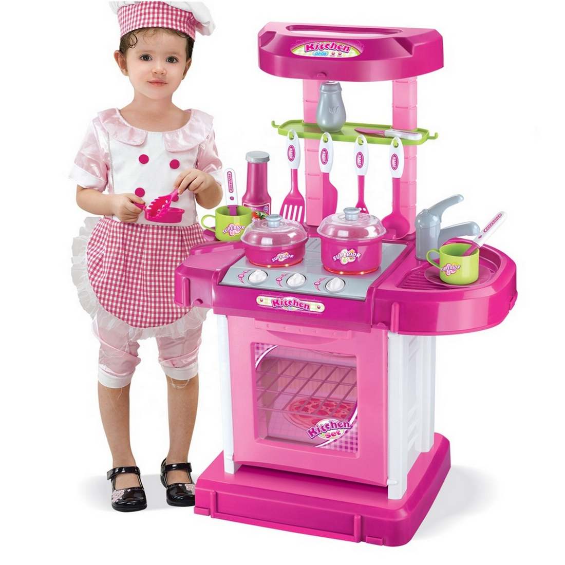 Incluye estufa, horno, fregadero y compartimentos para guardar accesorios, imitando una cocina verdadera.