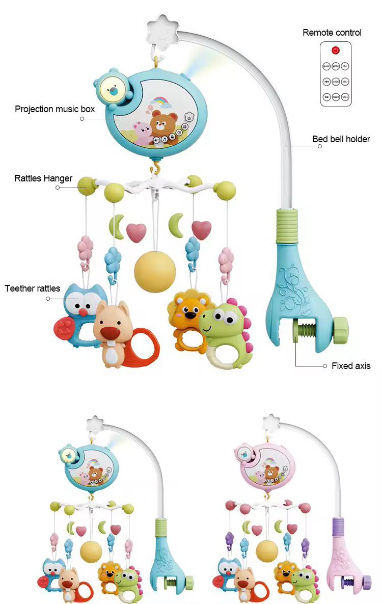 Móvil Musical para la cuna, con reflector que entretiene y relaja al bebe en la cuna. Nuevo diseño mas completo, con control remoto, diferentes melodías y reflector giratorio.