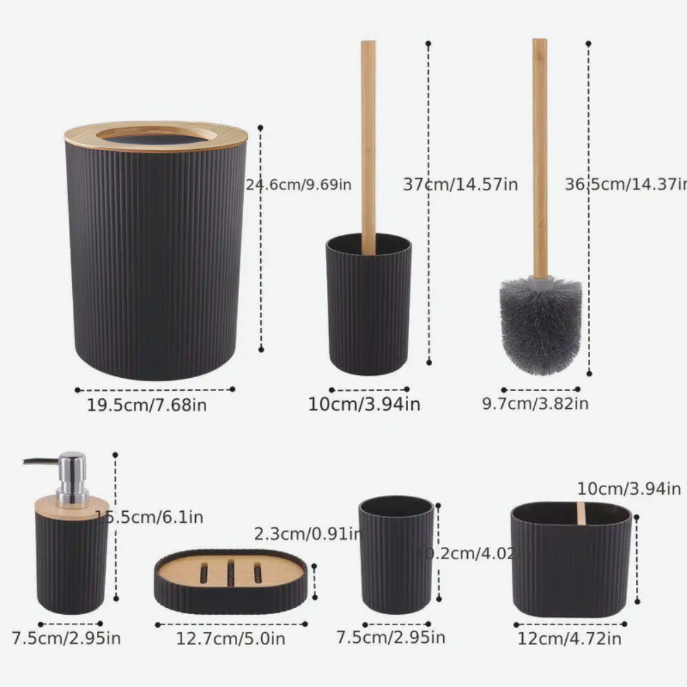 Versátil, duradero y moderno, este set combina practicidad con diseño minimalista, elevando la estética de tu baño al tiempo que te ayuda a mantenerlo limpio y organizado.
