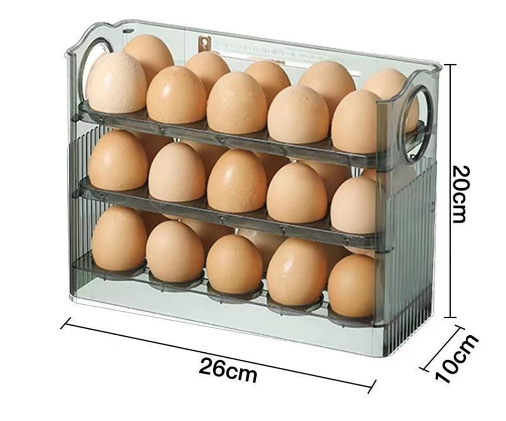Su diseño tipo “concha” hace que los huevos giren automáticamente hacia adelante al retirar uno, facilitando el acceso y asegurando que siempre uses los más antiguos primero.