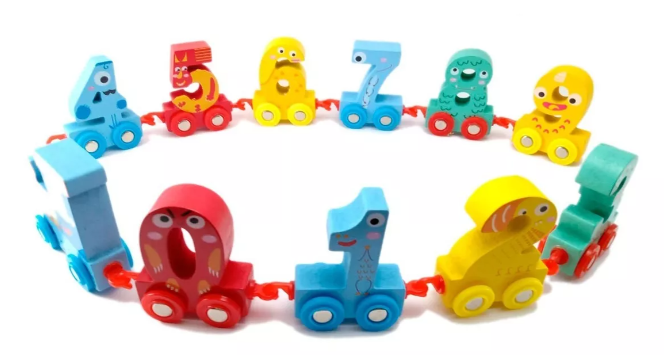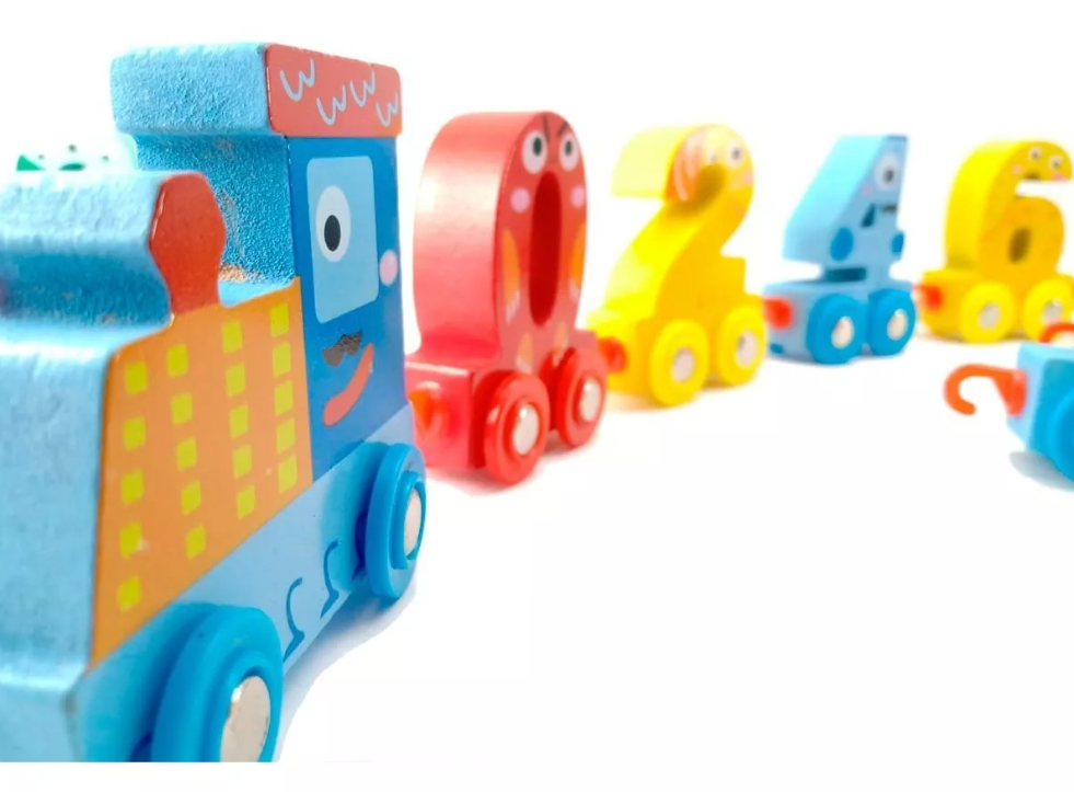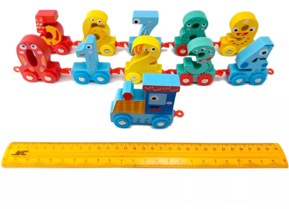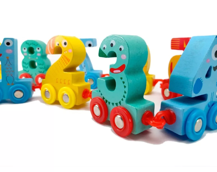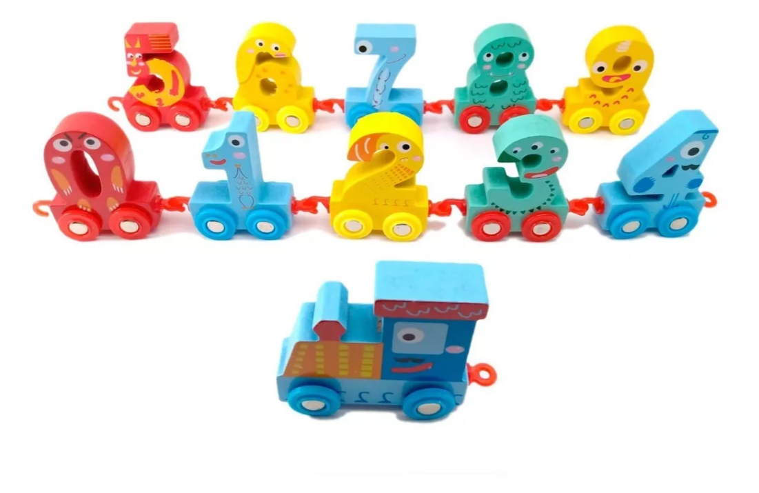 Cada vagón lleva un número grande, colorido y fácil de manipular, ideal para el reconocimiento temprano de cifras.